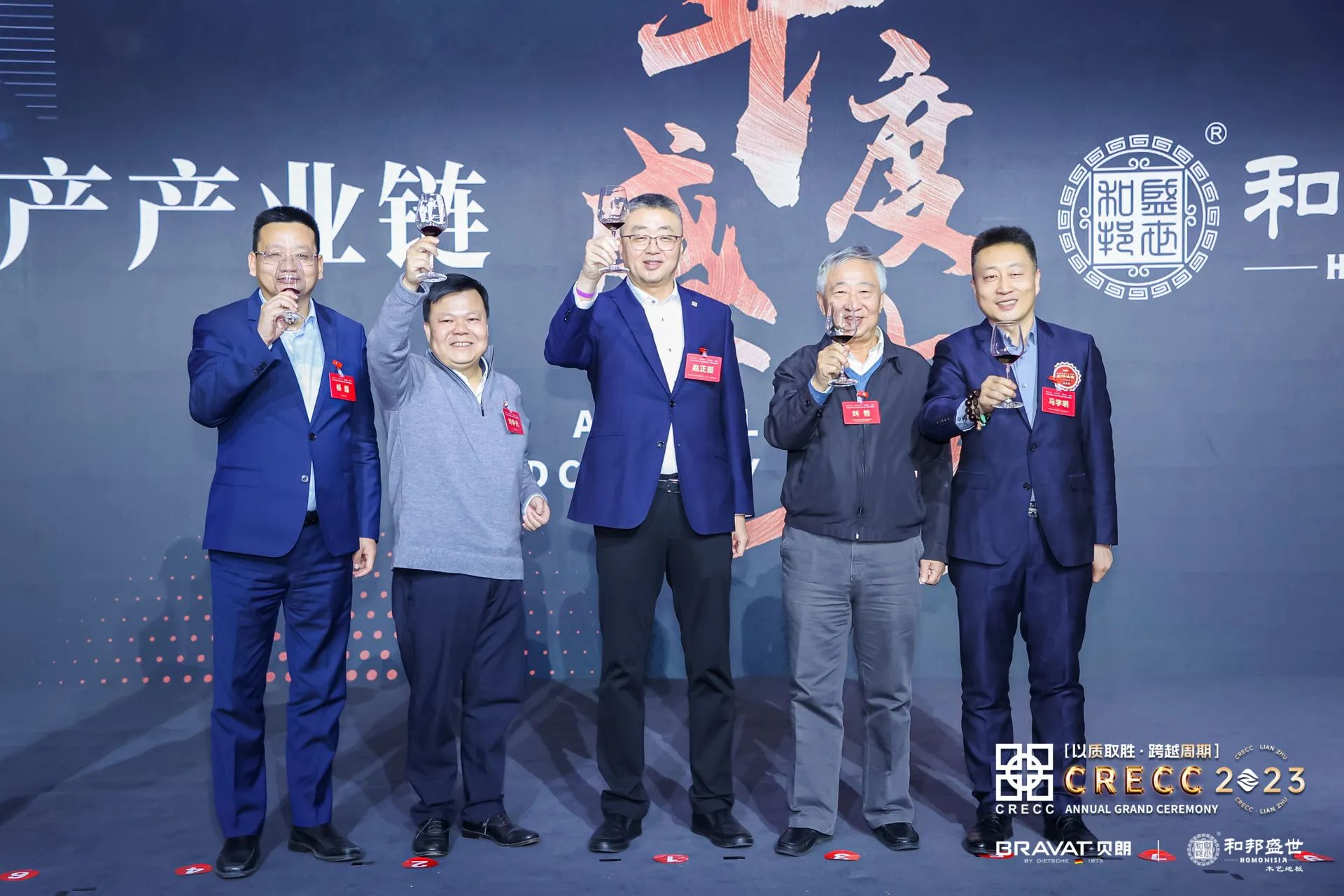 在随后的祝酒环节,全联房地产商会党委常务副书记、秘书长、链筑分会会长赵正挺先生;全联房地产商会链筑分会战略发展顾问、住建部市场监管司原副司长刘哲先生;全联房地产链筑分会副会长单位、德国贝朗(中国)副总裁杨磊先生;全联房地产商会副秘书长、链筑分会秘书长马学明先生与盛典冠名单位——佛山和邦盛世家居有限公司副董事长刘争光先生,共同为本年度的盛典晚宴祝酒。